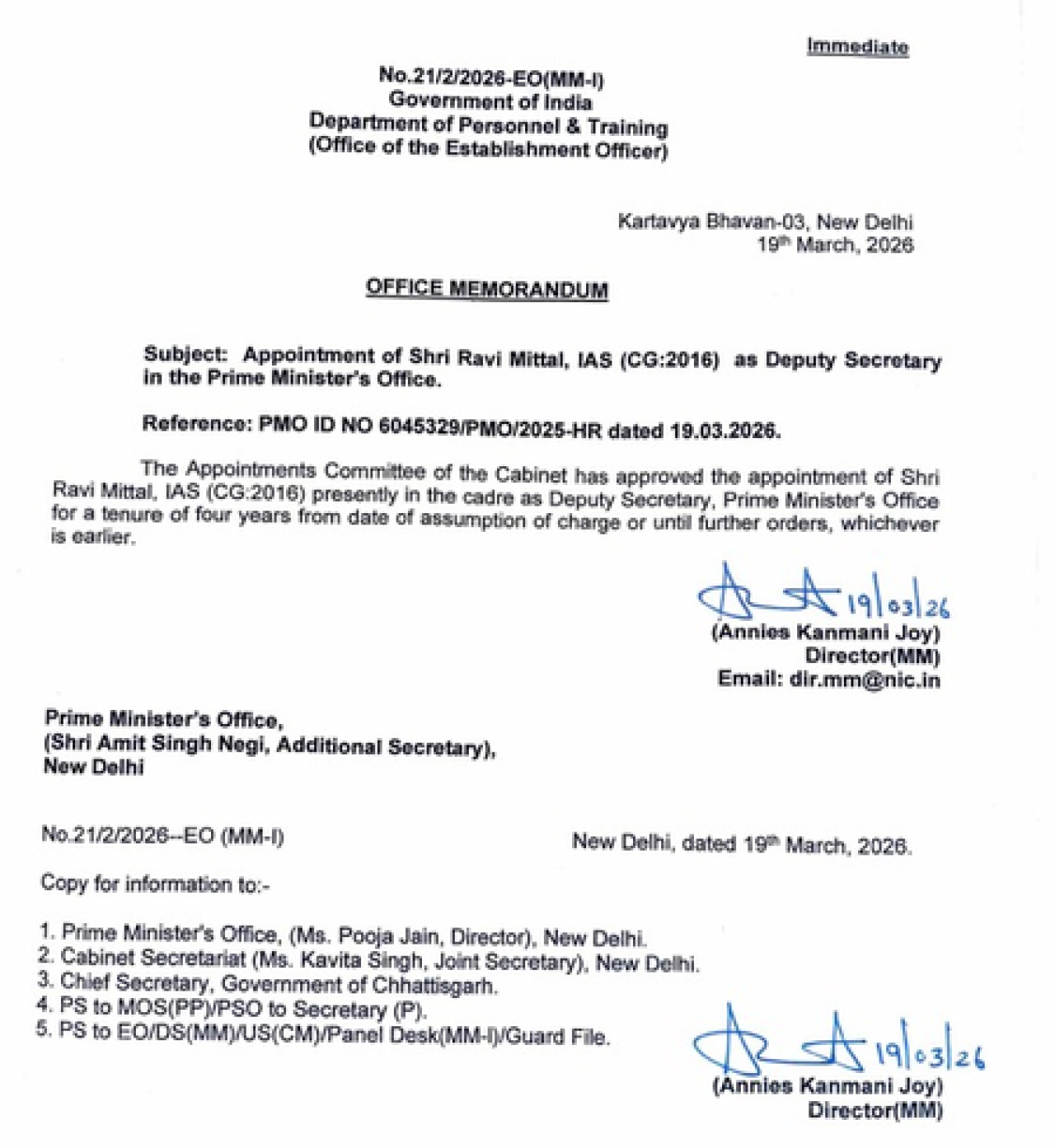 New Delhi, 19 मार्च . केंद्र Government ने छत्तीसगढ़ कैडर के 2016 बैच के आईएएस अधिकारी डॉ. रवि मित्तल को Prime Minister कार्यालय (पीएमओ) में उप सचिव (डिप्टी सेक्रेटरी) के पद पर नियुक्त कर दिया है.