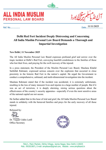 बोर्ड के अध्यक्ष मौलाना खालिद सैफुल्लाह रहमानी ने एक प्रेस बयान जारी कर इस घटना को अत्यंत दुखद और चिंताजनक बताया. उन्होंने कहा कि देश की राजधानी के सबसे संवेदनशील इलाकों में से एक लाल किले के पास इस तरह की घटना होना सुरक्षा व्यवस्था पर गंभीर प्रश्न खड़े करता है. उन्होंने सवाल उठाया कि इस विस्फोट के बारे में पहले से सुरक्षा एजेंसियों और Government को कैसे नहीं पता चला, यह सोचने का विषय है.