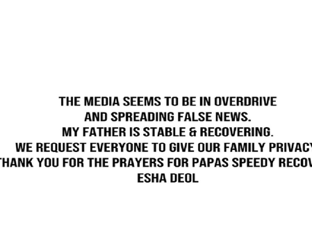 ईशा देओल ने social media पर एक पोस्ट शेयर किया है और लिखा है, “मीडिया इस मामले पर ज्यादा ही सक्रिय चल रही है और गलत खबरें फैला रही है. मेरे पिता स्टेबल हैं और रिकवर कर रहे हैं. मेरी आप सभी लोगों से रिक्वेस्ट है कि वे हमारे परिवार की निजता का सम्मान करें. पापा की स्पीडी रिकवरी के लिए दुआ करें.”