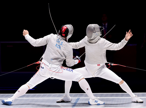 प्रत्येक टच पर एक अंक दिया जाता है. प्रत्येक मुकाबले को तीन मिनट के तीन राउंड में खेला जाता है. प्रत्येक राउंड के बीच एक मिनट का ब्रेक होता है. अगर कोई तलवारबाज पिस्ट के अंतिम छोर से बाहर पैर रख दे, तो भी प्रतिद्वंद्वी को अंक दिया जाता है.