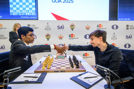 पणजी, 11 नवंबर . फिडे विश्व कप 2025 में Tuesday को आर प्रज्ञानंदा ने ग्रैंडमास्टर डेनियल डुबोव के खिलाफ सफेद मोहरों से खेलते ड्रॉ खेला. वहीं ग्रैंडमास्टर अर्जुन एरिगैसी, ग्रैंडमास्टर कार्तिक वेंकटरमन और ग्रैंडमास्टर पी हरिकृष्णा ने चौथे राउंड के पहले मैच में काले मोहरों से अंक बांटे.