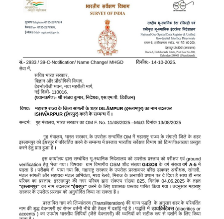 इस्लामपुर नगर परिषद ने 4 जून 2025 को संकल्प संख्या 825 के तहत शहर का नाम बदलकर ईश्वरपुर करने का प्रस्ताव पारित किया था. Maharashtra Government के इस प्रस्ताव को वरिष्ठ डाकघर अधीक्षक, सांगली और सहायक मंडल अभियंता, मध्य रेलवे, मिराज ने भी अनापत्ति प्रमाण पत्र देकर समर्थन किया है. भारतीय सर्वेक्षण विभाग ने अपने परीक्षण में पाया कि प्रस्तावित नाम परिवर्तन मान्य प्रक्रियाओं के अनुरूप है.