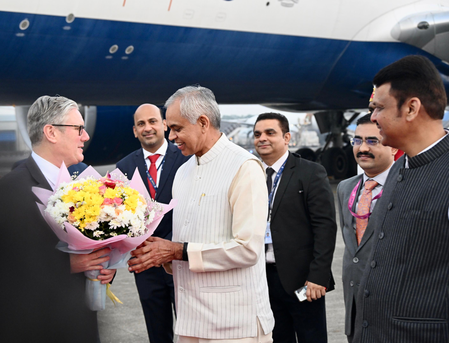 New Delhi, 8 अक्टूबर . ब्रिटेन के Prime Minister कीर स्टार्मर दो दिवसीय यात्रा पर India पहुंचे हैं. Wednesday की सुबह Mumbai के छत्रपति शिवाजी महाराज इंटरनेशनल एयरपोर्ट पर Maharashtra के गवर्नर आचार्य देवव्रत ने उनका स्वागत किया. इस दौरान Maharashtra के Chief Minister देवेंद्र फडणवीस और डिप्टी सीएम एकनाथ शिंदे भी मौजूद रहे.