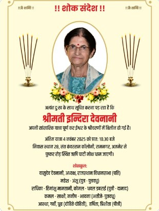 jaipur, 3 नवंबर . Rajasthan विधानसभा अध्यक्ष वासुदेव देवनानी की पत्नी इंदिरा देवी का Monday को jaipur के सवाई मान सिंह (एसएमएस) अस्पताल में निधन हो गया. उन्होंने इलाज के दौरान मेडिकल आईसीयू में अंतिम सांस ली.