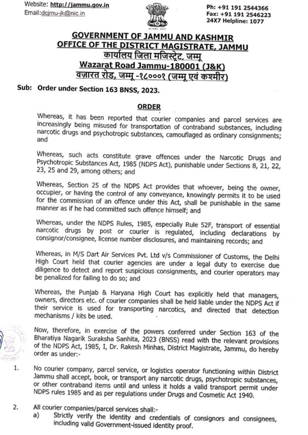 आदेश के मुताबिक जिला जम्मू में कार्यरत कोई भी कूरियर कंपनी, पार्सल सेवा या लॉजिस्टिक्स ऑपरेटर तब तक किसी भी मादक दवाओं, मनोदैहिक पदार्थों या अन्य प्रतिबंधित वस्तुओं को स्वीकार, बुक या परिवहन नहीं करेगा, जब तक कि उसके पास एनडीपीएस नियम 1985 के तहत और ड्रग्स एंड कॉस्मेटिक अधिनियम 1940 के तहत विनियमों के अनुसार वैध परिवहन परमिट न हो. यह आदेश तत्काल प्रभाव से लागू हो गया है और अगले आठ हफ्तों तक चलेगा या जब तक कोई नया आदेश नहीं दिया जाता.