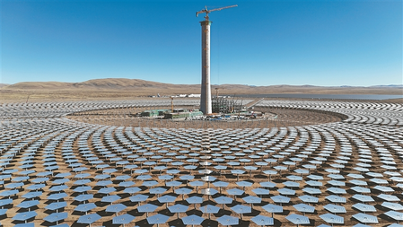 शीत्सांग के पहले सौर तापीय विद्युत संयंत्र के ऊष्मा-अवशोषक टावर का शिखर-स्थापना पूरा